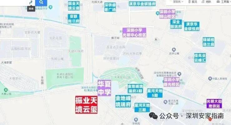 交通配套:振业天境云玺毗邻光侨路、光明大道等主干道,可通过南光高速、龙大高速40分钟通达福田、南山;距离6号线光明大街站约1.3公里(步行需要20分钟),凤凰城距离约2.1公里(步行需要30分钟),其中凤凰城可换乘13号地铁线,预计2026年全线开通运营,9站到南山留仙洞,12站到南山高新园。