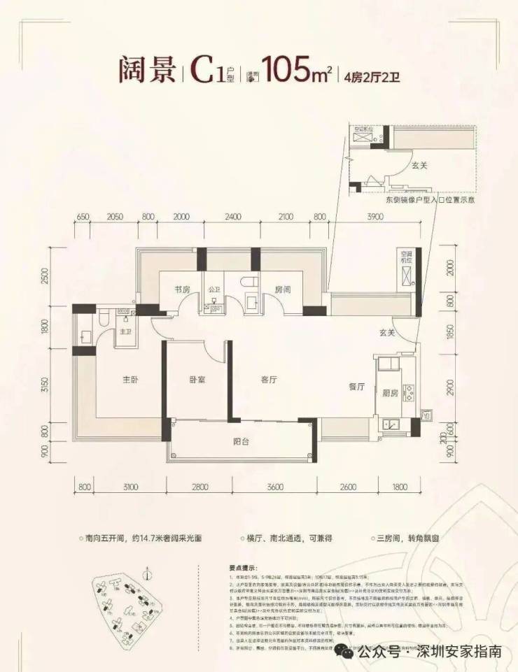 105㎡的4房2厅2卫,设计的是横厅南北通透格局,客餐厅6.2米开间,五开间朝南,约14.7米奢阔采光面,分别做到了主卧16.9㎡/次卧8.96㎡/次卧8.12㎡/次卧7㎡(包含墙体飘窗),U型厨房,卫生间干湿分离,得房率约100%(包含赠送),客厅连接次卧出10.88㎡的大阳台,首推的1/2栋主朝西南向。赠送面积约25.72㎡。