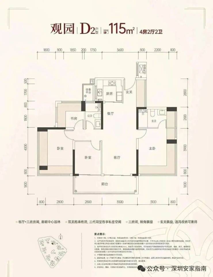115㎡的4房2厅2卫,设计的是竖厅双龙抱珠格局,客厅3.5米开间,四开间朝南,分别做到了主卧18.33㎡/次卧17.28㎡/次卧10.36㎡/次卧7.41㎡(包含墙体飘窗),U型厨房,卫生间干湿分离,还带1个设备平台,得房率约100%(包含赠送),客厅连接次卧出11.34㎡的大阳台,西南朝向。赠送面积约27.59㎡。