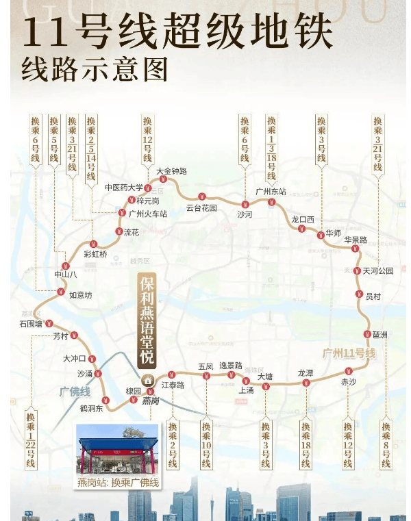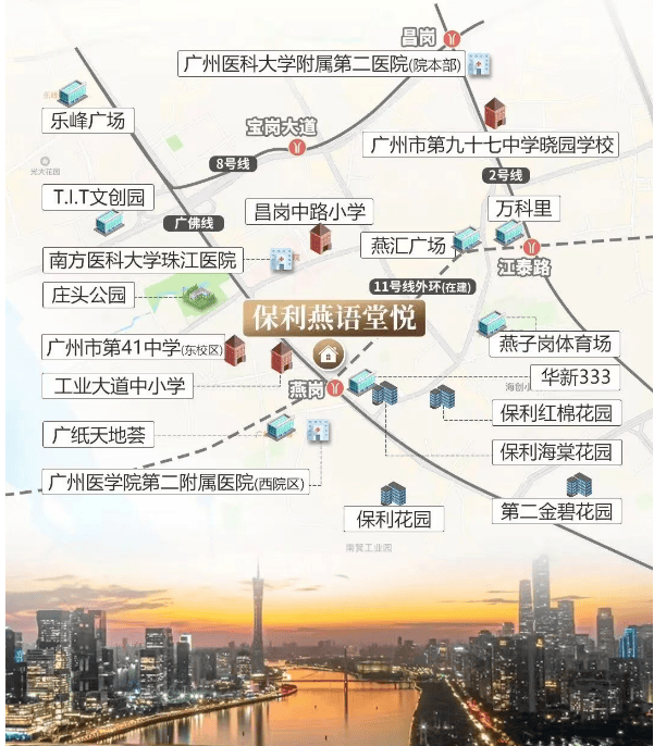 燕语堂悦最大的交通优势,在于它是真正的“双地铁上盖”——步行不到200米即达燕岗站,无缝接驳广佛线与广州地铁11号线(环线)。11号线作为“换乘之王”,8站直达琶洲,7站换乘3号线抵达珠江新城,通勤效率极高。对于在琶洲电商总部、珠江新城金融区或广佛交界工作的群体而言,这里是黄金通勤节点。地面交通同样发达:项目紧邻工业大道主干道,5分钟接入新滘西路与环城高速,20分钟车程覆盖广州核心区。周边500米内设13个公交站点、28条线路,纸厂站举步即达,无论地铁、公交还是自驾,出行选择多元且高效,真正实现“全维立体交通网”。
