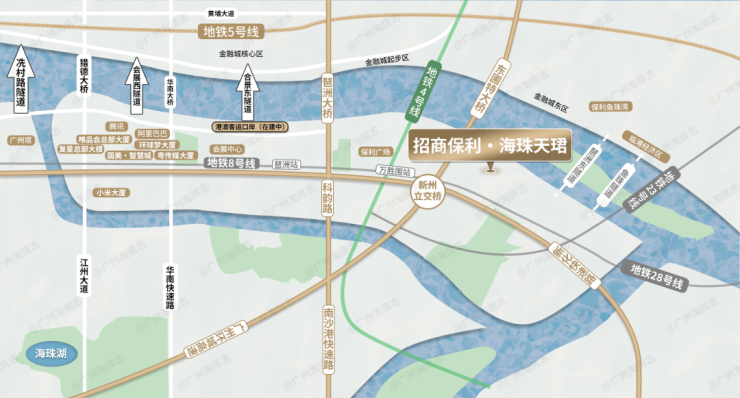 广州动物园等,公交出行十分便利。地铁:板块内现有地铁线路为4号线、8号线和18号线,在建的11号线也将在此设站。地铁站主要有磨碟沙站(8号线和18号线)、新港东站(8号线)、琶洲站(8号线和11号线)、万胜围站(4号线和8号线),板块内线路和站点密集,地铁出行非常便利。公园配套:琶洲板块位于珠江南岸,板块内公园主要有磨碟沙公园、珠江琶醍啤酒文化创意艺术区、会展公园、广州水博苑(琶洲塔公园)、黄埔古港景观区。公园众多,且坐拥一线江景,环境优越。医疗配套:琶洲街黄埔社区卫生服务站设在黄埔古港景观区内靠近黄埔村牌坊的位置,距海珠天珺约300米,疫苗接种、感冒、抽血、B超等小型检查科目可以在此就诊。大型医院:项目旁则有3家三甲医院,分别是广东省第二人民医院、南方医科大学中西医结合医院、中国人民解放军陆军第七十四集团军医院(原四二一医院),距离小区均在6公里左右,优质医疗资源非常丰富。教育资源:幼儿园:项目西南位置规划建设一所幼儿园,建成时间和名称待定。地段小学:周边1公里内的公立小学有海珠区黄埔小学和新洲小学。对口中学:小升初采用电脑派位的方式进行,项目周边地段对应海珠区小升初第十组,将在广州市第六中学、广州市第四十一中学(校本部)、广州市海珠区黄埔中学、广州市执信中学琶洲实验学校这些学校中随机指派一所学校为对口初中。商业配套:附近有保利广场(1.7KM)、万胜广场(1.8KM)、环 汇商业广场(2KM)、琶洲商业广场(1.8KM)等大型商业综合体,但都是2公里范围内,距离较远。项目规划带有滨江商业,要解决日常所需就要靠项目自身底商了。