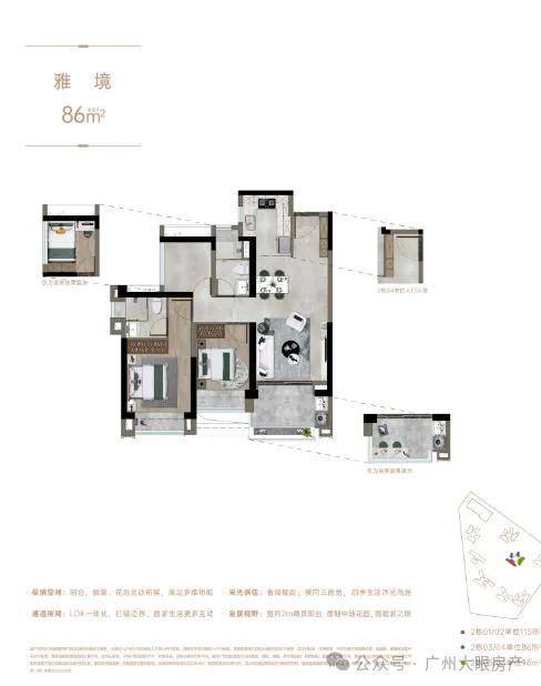 2 栋:约 86 ㎡三房、98 ㎡三房、115㎡四房