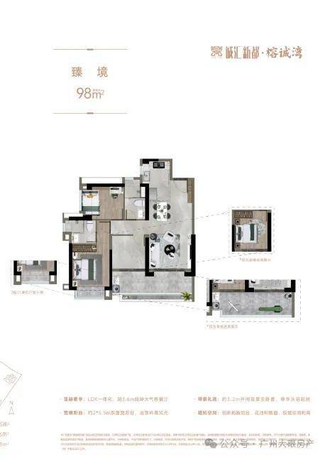 主城区一线江景土地资源稀缺,就在白鹅潭 CBD 里。精选 2 栋优质房源, 300万起86m²三房,400万起南向98m²三 房,瑧享进深2x6.5米的13m²超大景观阳台 ,从阳台往外望,四座公园、南向一线花地河景观尽收眼底。