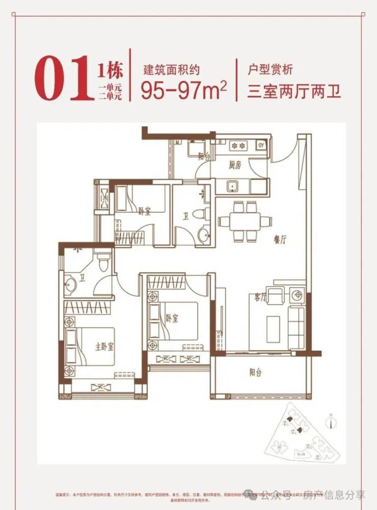 约95-97㎡三房:南向端头位,三面采光,花园瞰景。