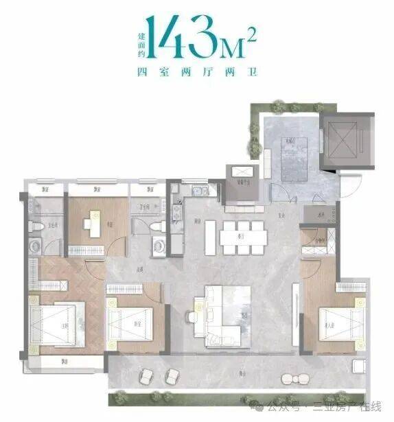 建面约143㎡平层奢宅:方厅+双厨设计,适合多人家庭欢聚