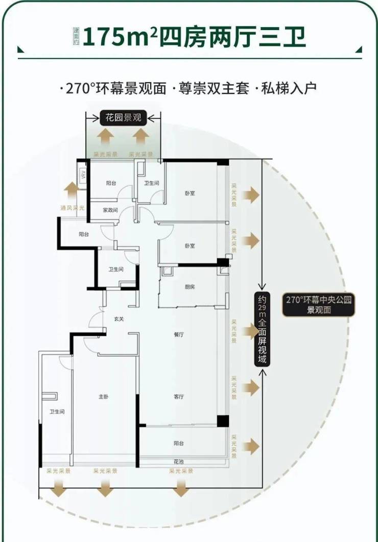 建面175平四房三卫,全屋拥有29米的一线公园景观面,LDKG大通厅,面积约64平,270度全面边厅设计,公园景观面达到29米