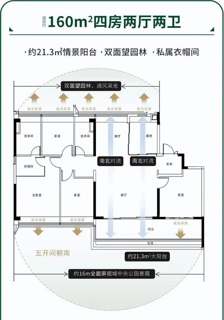 建面160平四房两卫,独立电梯厅,五开间朝南,270度转角阳台,面积约21.3平,中西式可开可关厨房