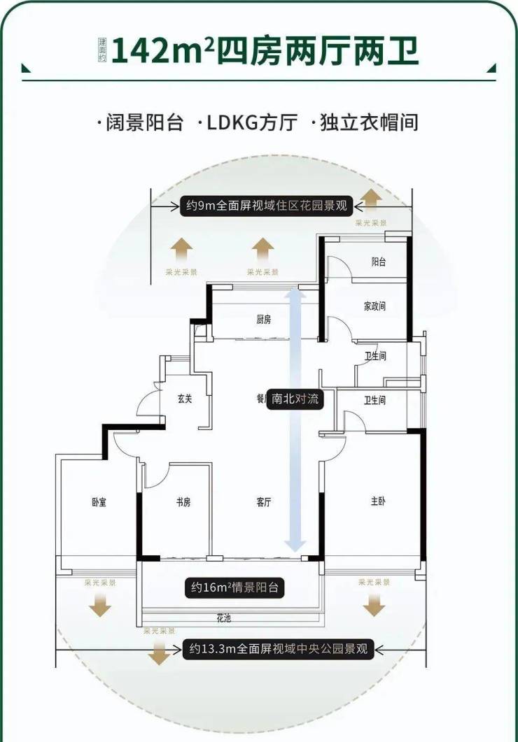 建面142平四房两卫,四开间朝南,面宽14.8米,南北对流,LDK餐客厅一体化,阳台面积约16平,私享电梯厅入户