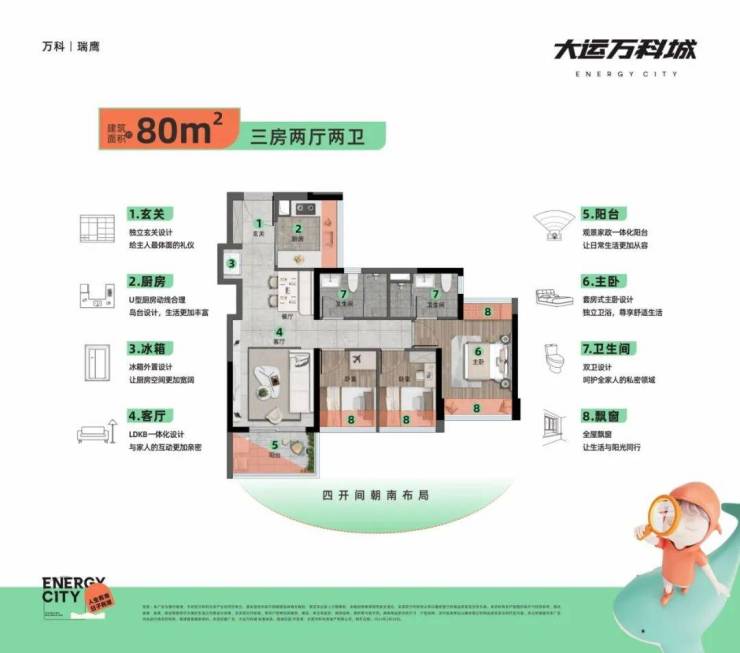 80平三房两卫,市面上最高的约94-98%可使用率,可以与其他89-95的户型套内面积媲美,10.85-12.9米的南向面宽,户型方正实用。