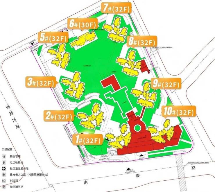 这条十字中轴沿着南泰路两侧展开,把地块南北两侧、住宅区内部的集中绿地串联,构建出约3.2万方社区内大花园 + 外部双公园结构;