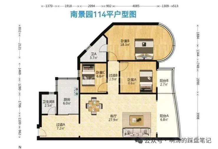 南景园:建成2000-2005年,65平两房至137平四房,贝壳近期成交价3万/平,中间面积114平户型为三房两卫。