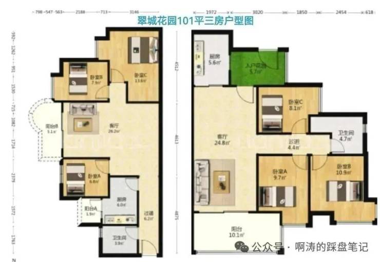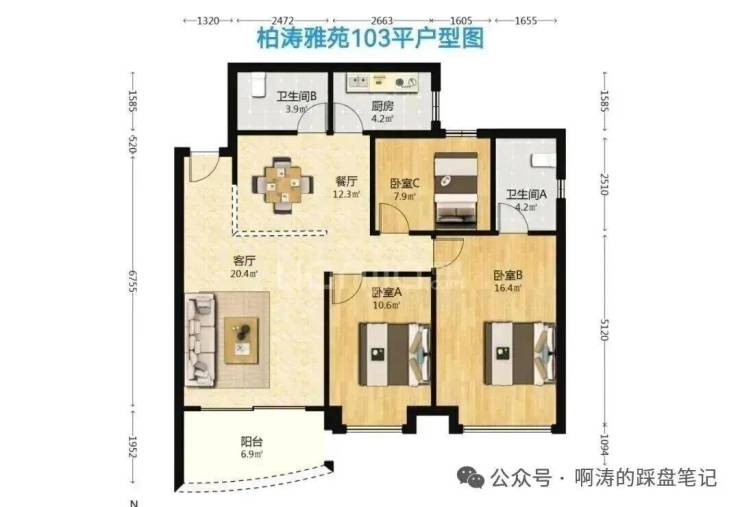柏涛雅苑:建成于2001-2008年,38平一房至130平四房,贝壳近期成交价3.16万/平,中间面积103平户型为三房两卫。