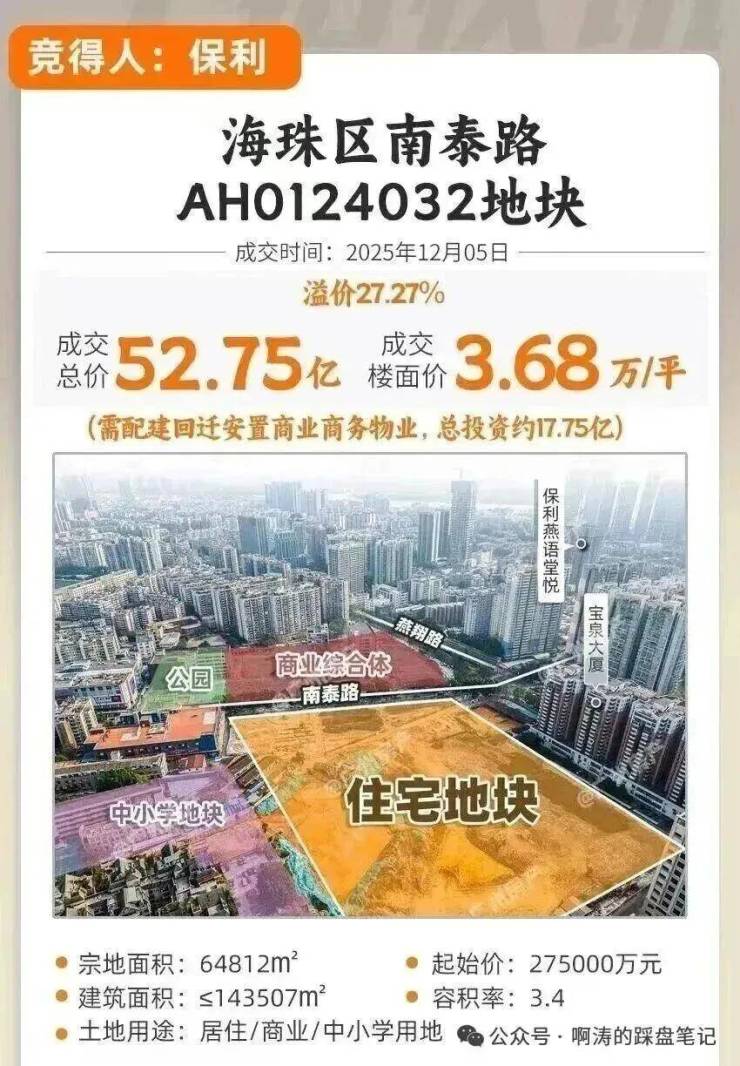 海珠西南泰路地块(即翠城花园东地块),经过76轮激烈竞价,被保利以350000万元总价拿下!