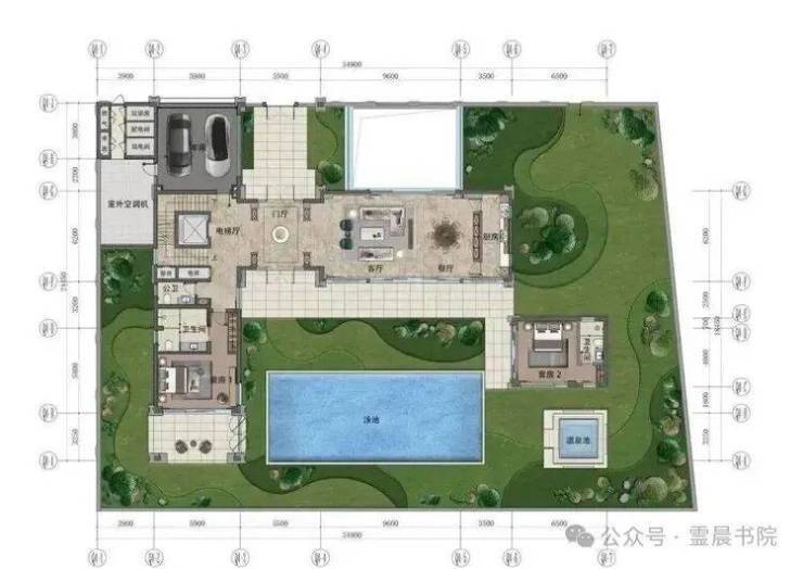 温泉别墅融合东方建筑精髓与西方设计理念,所有空间都无限接近自然,无墙化绿洲式景观设计,每户带8-10个庭院,长达 15-30米的面宽,一经推出便赢得了“史上最美庄园别墅”的美誉。