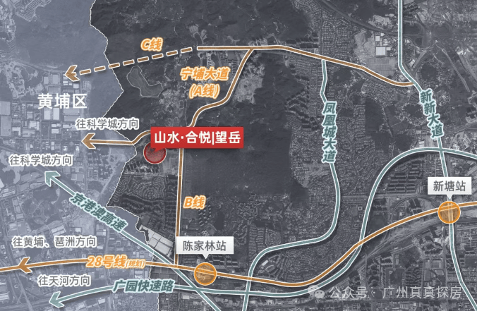 如果选择地铁出行,有规划中的28号线的陈家林路站,距离项目大概只有900米左右,目前规划站点在合生湖山国际那边,但还是存在一定的不确定性,地铁建好开通以后,坐地铁去天河、海珠、黄埔等区也非常方便。