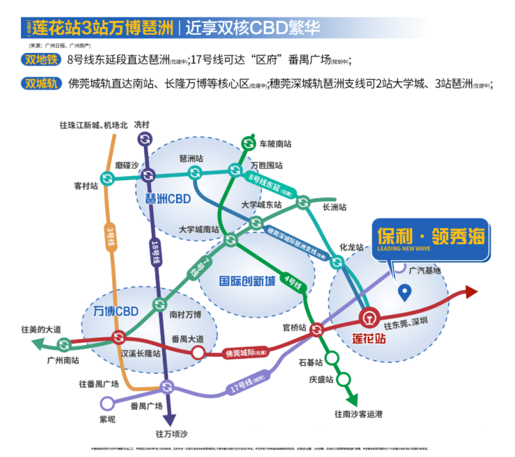 保利领秀海为央企保利匠心力作的滨海品质大城。项目扼守南大干线,无缝衔接新化快速,轻松速抵琶洲;更规划双地铁+双城轨立体路网,3站即达琶洲、4站直通广州南出行高效便捷。同时,项目雄踞珠江入海口狮子洋畔,坐拥一线270°环幕海景,推窗即亨壮阔海天盛景。