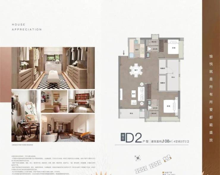 户型设计合理,空间利用率高。例如D2户型为四居室、南北设计,建面约108㎡,4空间2厅2卫,花园平层,舒适宽厅,赋予自在人生