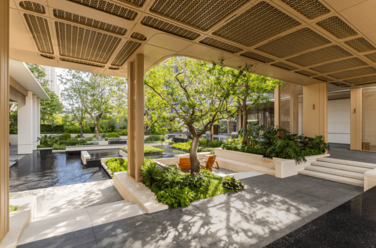穿行其中,你能听到潺潺流水,能看到满眼绿意、坐在下沉的度假感十足的休憩空间里,手能触摸到水面,五官联动五感,每一寸都能体现招商·林屿间的巧妙匠心。