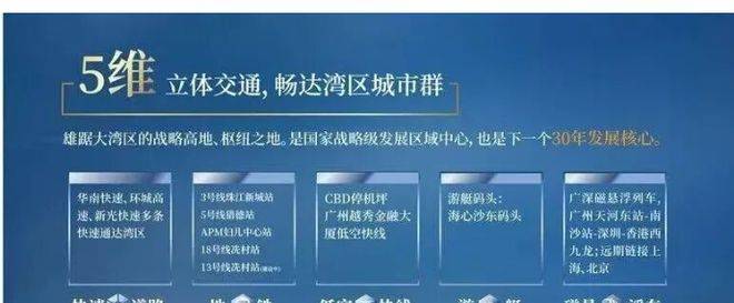 全维交通网络:低空快线设有 CBD 停机坪(广州越秀金融大厦低空快线);轨道交通有 3 号线、5 号线、APM 线、18 号线及建设中的 13 号线、规划中的广深磁悬浮;快速路如华南快速、环城高速、新光快速等多条线路通达湾区;还有海心沙东码头(可停靠游艇半小时),实现海陆空全方位便捷出行。
