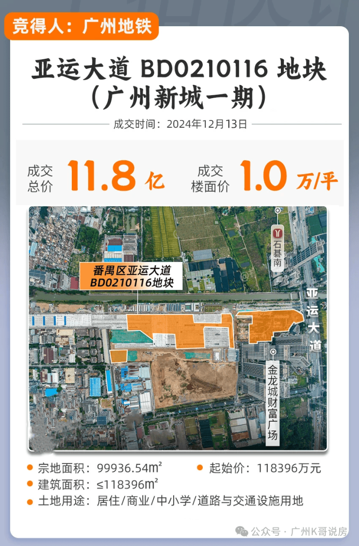 2024年12月广州地铁拍下亚运大道BD0210116地块(广州新城一期),折合拿地价不过1万/㎡。