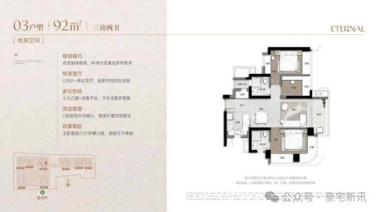 92平3房2卫,朝东(户型:治愈潮流宅,温馨优雅设计)