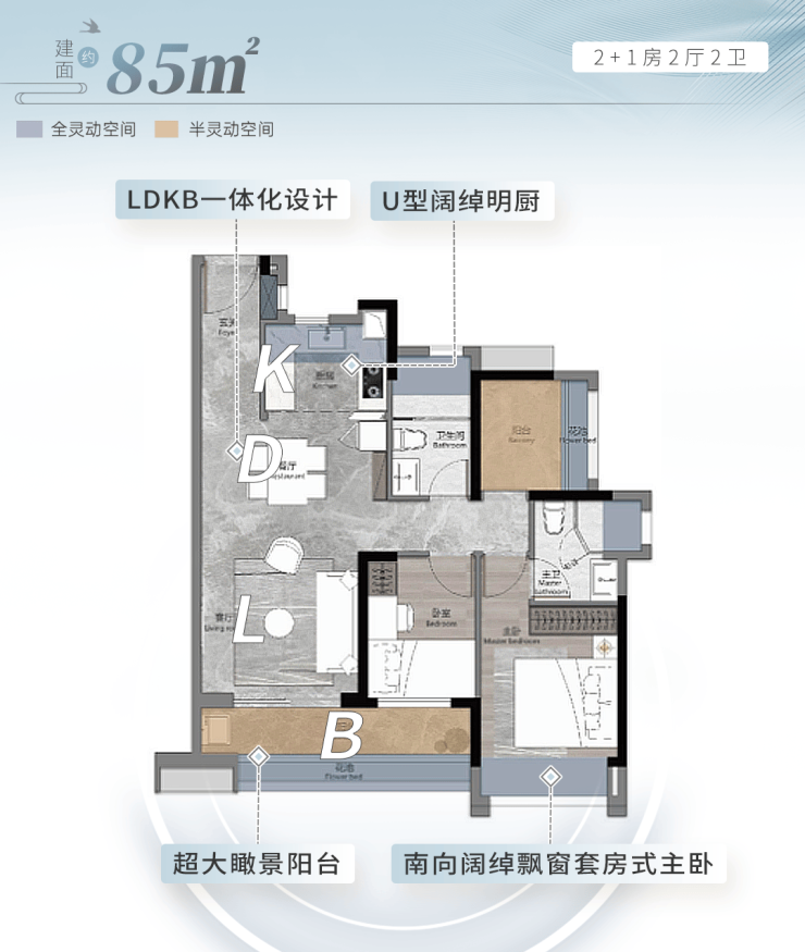 建面约85㎡2+1房,景观阳台尺度可与100㎡户型媲美,主卧配合X空间灵活调整,打通次卧作衣帽间/化妆间等,不成问题。建面约85㎡2+1房,景观阳台尺度可与100㎡户型媲美,主卧配合X空间灵活调整,打通次卧作衣帽间/化妆间等,不成问题。