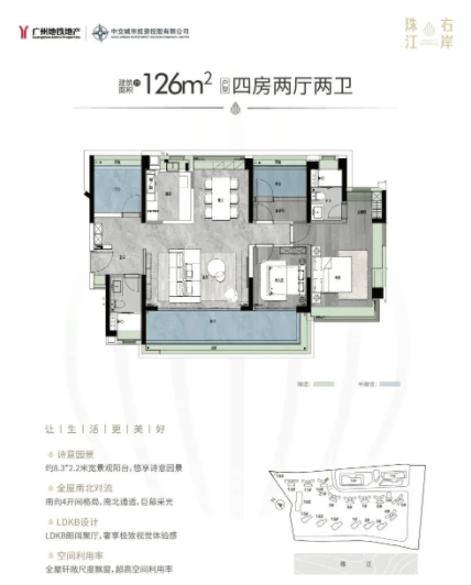 建面约126㎡四室两厅两卫有两种布局,一种是南北通透设计