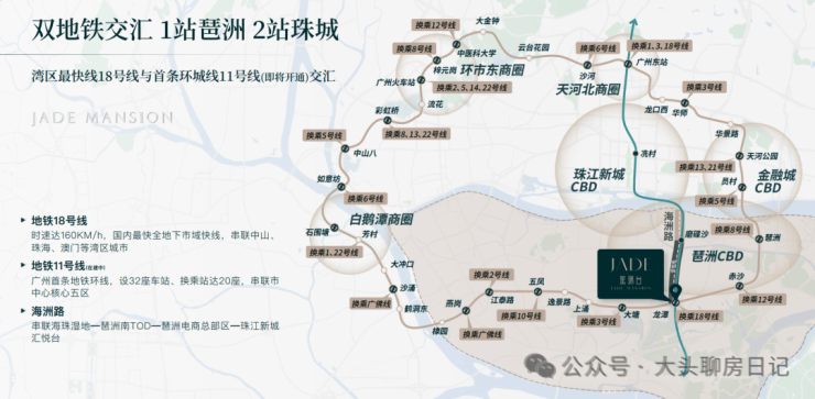 地铁11号线(在建中) :广州首条地铁环线,设32座车站、换乘站达20座。 海洲路:串联海珠湿地-琶洲南TOD-琶洲电商总部-珠江新城汇悦台