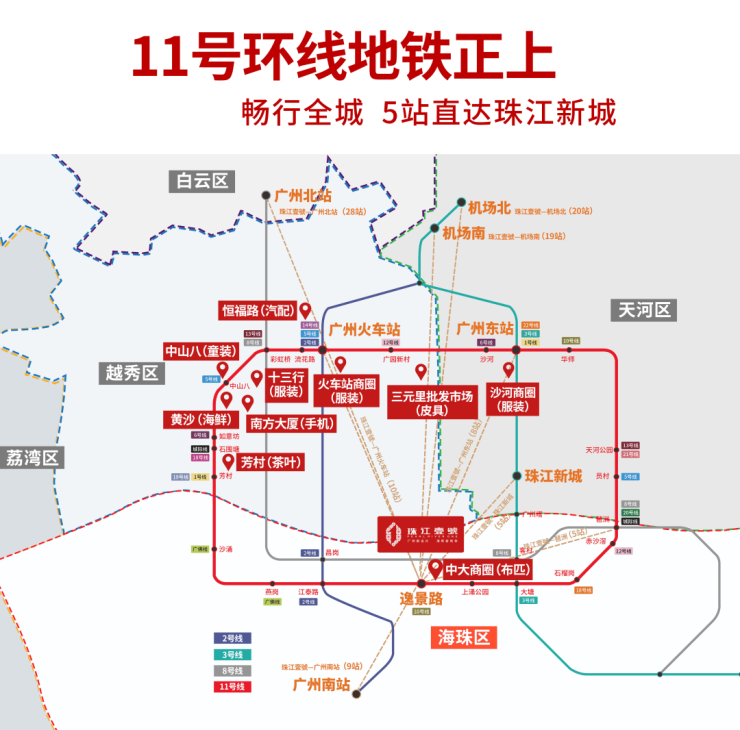 广州首条环线地铁11号线逸景路站正上,负一层与地铁站联通,连接天河、越秀、荔湾、白云和海珠中心五区,串联广州十大专业市场,5站直达珠江新城,预计2022年底通车,届时珠江壹號业主将畅享便捷出行。