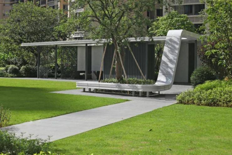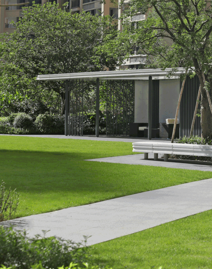 中心庭院休闲廊架与活力草坪、树阵广场做了细致的功能分离,既彼此独立又互相依存。满足邻里的户外社交需求,提供舒适的休息活动空间,设计在有限的空间内构建日常生活方式的诗性时间。