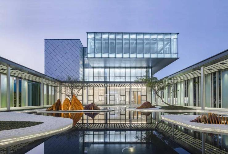 深色镜面水景与周边场地自然过渡,使空间得以无限延伸,婆娑树影静静倚躺水中,可谓是水木涵澄景。