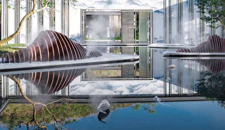 GND杰地在本案景观设计中从原场地环境汲取灵感,以绿林、山丘、云雾、水景几种自然景观作为空间的灵感元素,用现代手法演绎“山水云间”的辽远与轻盈、灵性与意趣,将自然的力量延续其中,重塑一个崭新的景观形态,让人感觉仿佛回归山林的怀抱。