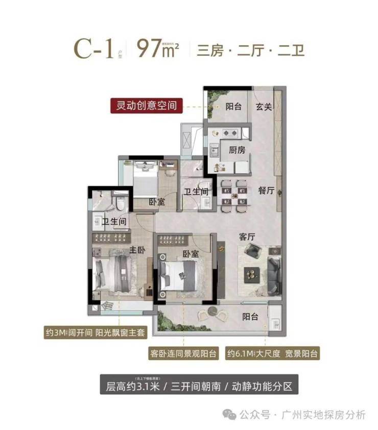 97㎡3+1房2卫,三开间朝东南,约6.1米大阳台,梅花岭一线山景,约96%高实用率,3.1米层高。