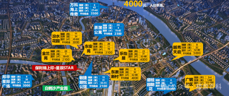 白鹅潭产业发展迅速,荔湾任职人口新增40万+,居住需求旺盛;花地湾中央居住区配套成熟,区域平均租金60元/㎡,投资回报高达约5%,公寓供应稀缺,市场建面约35-65m²的租赁价格平均约3500+元。