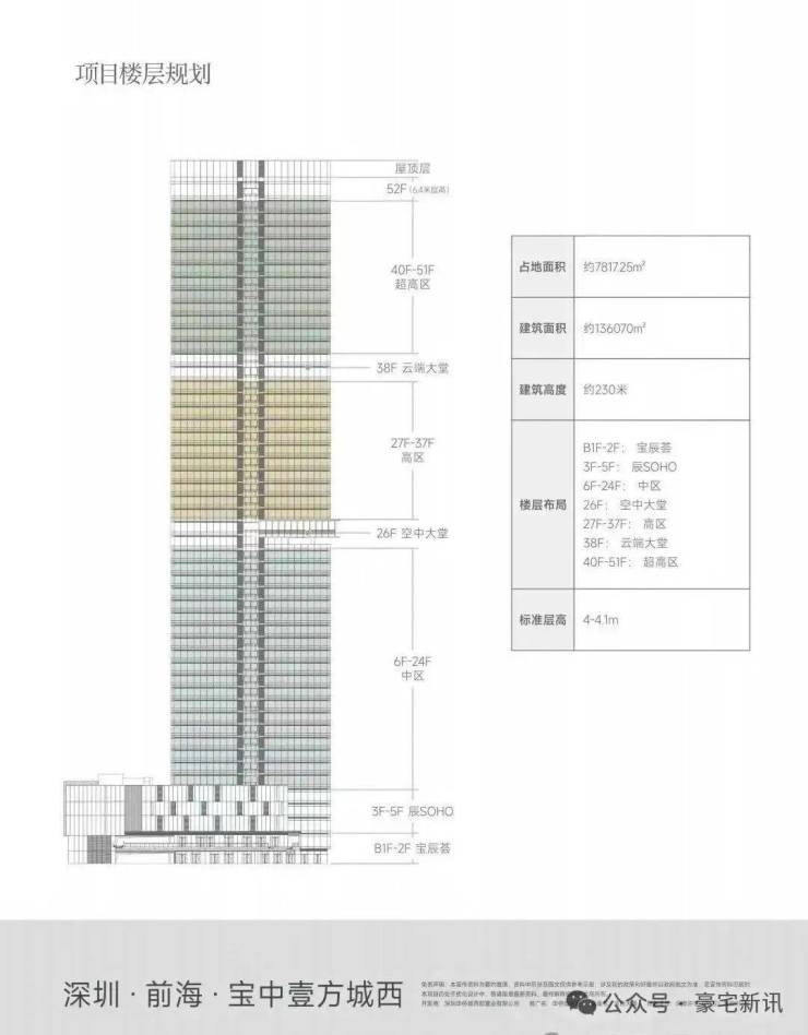 华侨城宝辰总高230米,为宝中最高楼;项目52层,分为中区、高区、超高区,6层起卖,11、39F为避难层,25-26F为空中会所,28F为空中大堂。除了空中大堂项目还有地下入库大堂+首层大堂,一共三重大堂。