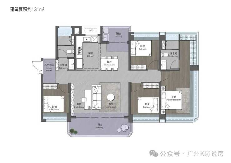 149㎡创意四房两卫,超大横厅连接环幕阳台,南北双阳台