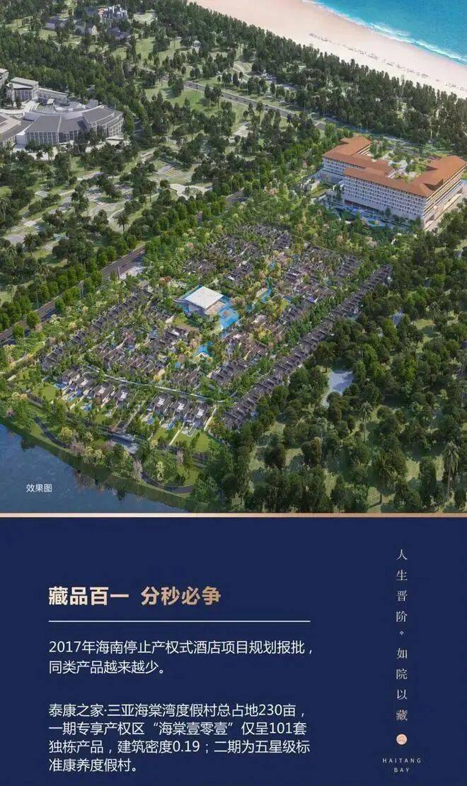 是泰康倾心打造的继泰康之家 CCRC 持续照护养老社区后的创新产品线,选址自然环境与未来发展俱佳的海棠湾一线,旨在满足全年龄段客户休闲度假、候鸟旅居、适老化等多元需求。分两期开:一期为专享产权区海棠壹零壹(101席中式独栋产品,建面约2万㎡,在售),二期为五星级标准康养度假村(建面约8万㎡,按五星级酒店标准投建)。