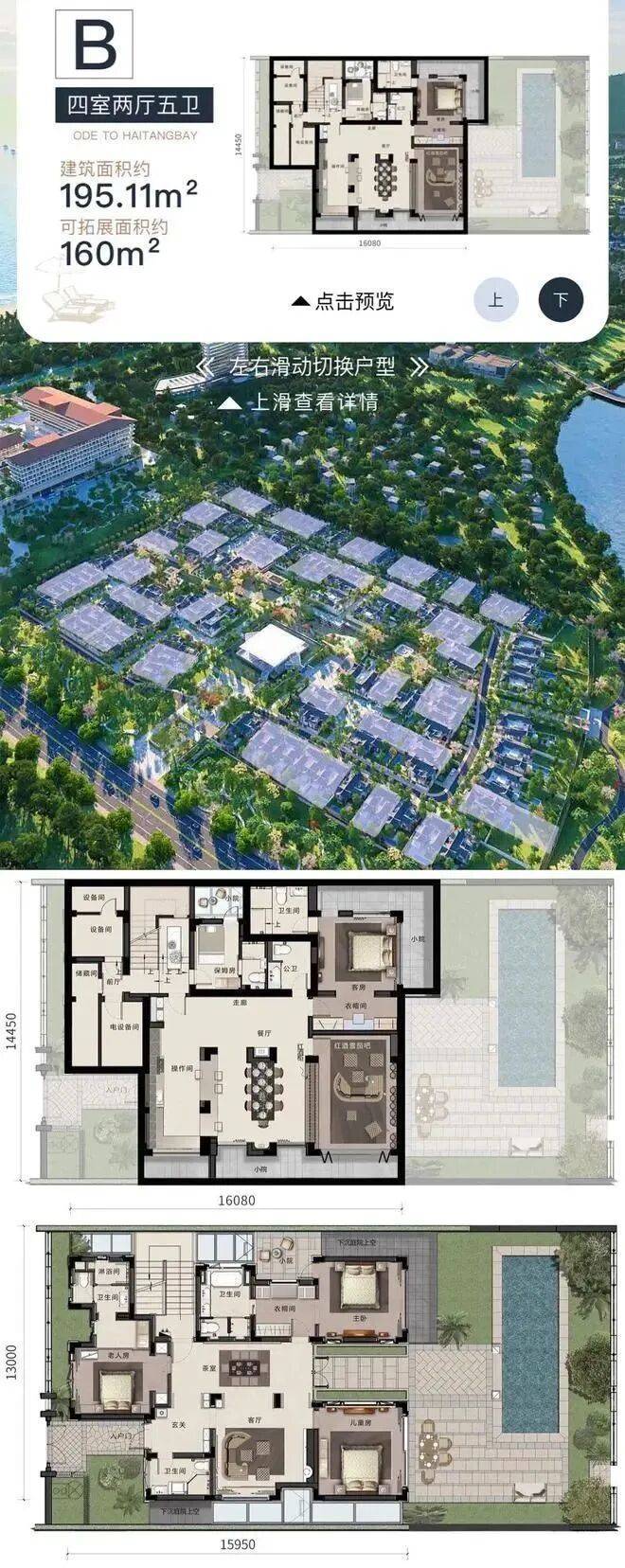 B户型:四室两厅五卫,建面约:195.11㎡ ,可拓展面积约:160㎡,占地面积约 332-998 ㎡