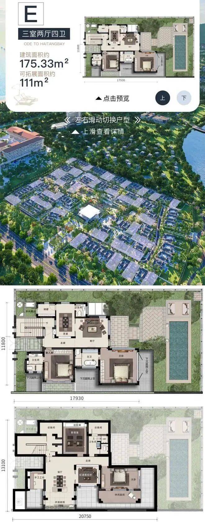 建筑面积175–275㎡,超大庭院(占地面积322–1366㎡)户户泳池,私家车位;敞阔两层户型设计,私享独院产品。