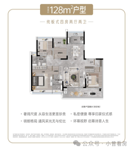128㎡三房两厅两卫是刚需友好型户型,总价约 614 万元起,三开间朝南,客厅连接阳台,采光充足,适合刚步入改善阶段的年轻家庭。