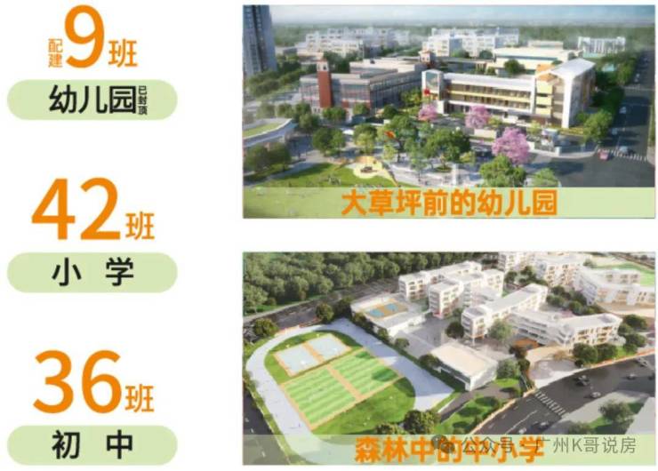 项目配建42班小学+36班中学的九年制学校,引进番禺中学教育集团办学,已开学。