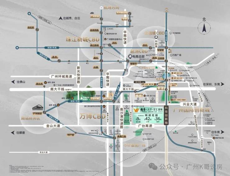 自驾出行:兴业大道/南大干线,番禺东西向发展大动脉,串联万博CBD/广州南站等板块;南沙港快速、新化快速、番禺大道:无缝衔金珠琶,另经金光东隧道,可速达大学城一期。