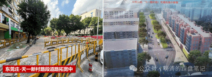 ● 主动退地改善道路面貌:东莞庄路(天河源筑)道路拓宽施工,未来将拓宽为双向四车道,前广场焕新升级中