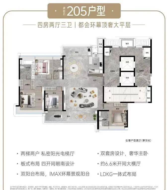·中轴园林上,环幕景观楼王·限量级CBD低密板式高层·专梯专户 | 私属电梯门厅,尽显私密尊崇·四开间朝南,南北对流阳光满格·双阳台设计,约10.3米宽巨幕阳台·双主卧套房,让孩子多一度独立空间·总统级主卧奢套,步入式衣帽间、双洗手台、浴缸