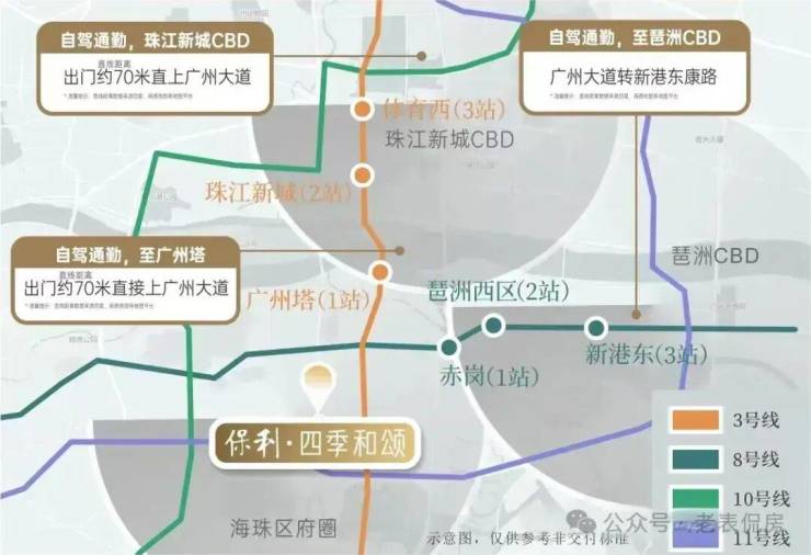 项目占据城市最核心的位置,左拥海珠成熟老城,右抱琶洲数字经济区,项目途径广州大道南,到珠江新城只需5公里,到琶洲只需11公里,顶尖的资源及产业都沿着这条中轴铺开。