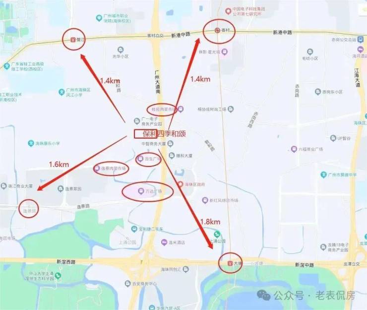 周边有3/8/10/11号线,4条地铁交汇,这四条地铁线两两垂直交叉,把小区围在一个长方形内,可接驳 3 号线与 8 号线交汇客村站、8 号线鹭江站及在建的广州环线 11 号线逸景路站,可实现 1站广州塔2 站珠江新城琶洲西区,3 站体育西,4 站昌岗商圈
