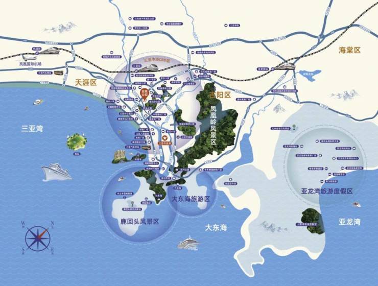 项目近临金鸡岭路、三亚河东路;城市中轴线凤凰路、鹿城大道穿梭而过;城市主干道迎宾路、解放路、落笔洞路、三亚湾路等交通网络;2公里三亚动车站,5公里环岛高速出入口,10公里凤凰机场,城市轻轨及多条公交路线停靠。立体交通网络,出行便捷无忧。