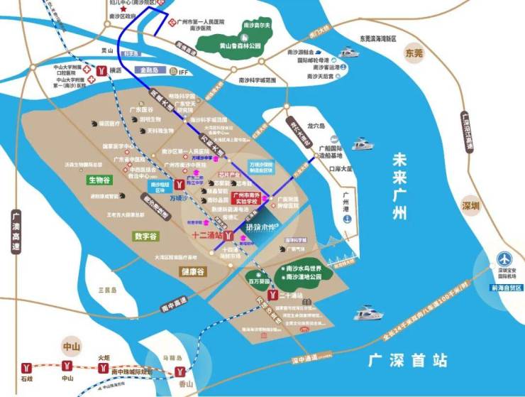 项目距离深中通道广州出入口约2公里,距离广州地铁18号线十二涌站约1.2公里,坐享广深中珠四地城际交通核芯。
