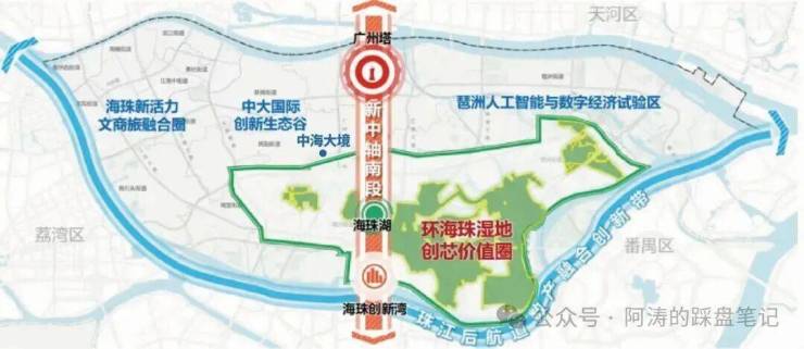 中轴南段左右两侧的环中央湿地价值圈与中大国际创新生态谷,以人工智能、数字经济、芯片制造与研发为核心产业,以极强的环境友好性促进广州完成高质量转型。