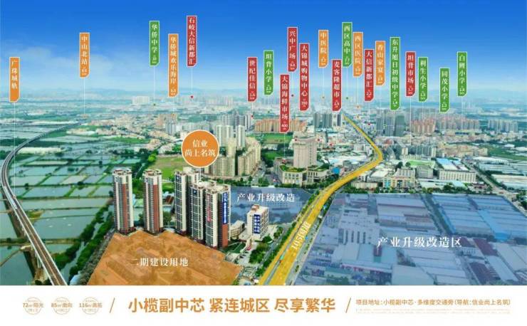 项目位于小榄副中芯,坐拥6大市场(坦背市场、大锦海鲜市场、同茂市场、乐民市场、兆益市场、白鲤市场)3大商圈(坦背市场商圈、大信新都汇商圈、壹加壹商圈)4大医院(东升医院、西区医院、中山中医院、中山人民医院),一站式成熟配套,尽享衣食住行无忧生活圈。